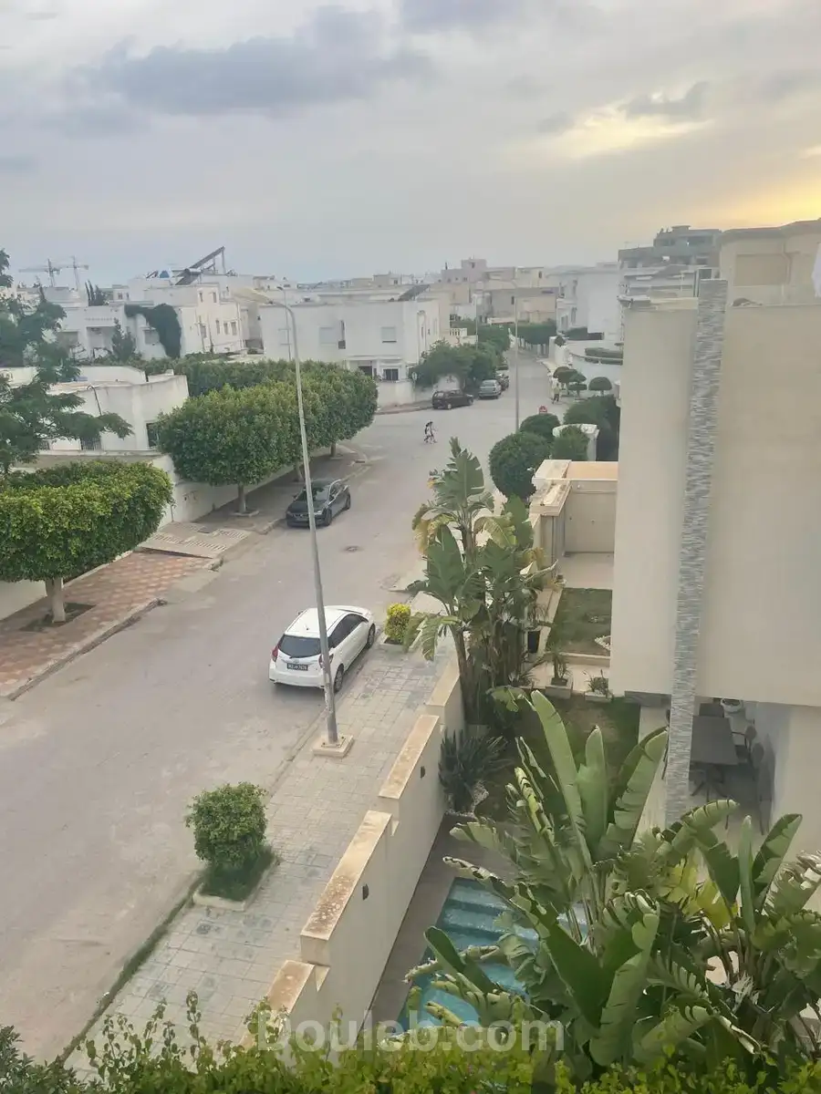 particulier loue un appartement s+2 à l'étage de villa nouvelle construction haut standing aux jardins de l'aounia côté villas derrière monoprix, voisinage calme et près de toute commodité se composant d'un salon ouvrant sur un balcon,cuisine aménagée équipée ouvrante de même sur le balcon,deux chambres à coucher et une salle de bain revêtement grès à la masse,chauffage central, climatiseur, portes et cuisine en bois massif vitres et stores en aluminium, interphone idéal pour jeune couple ou une petite famille svp non sérieux s'abstenir