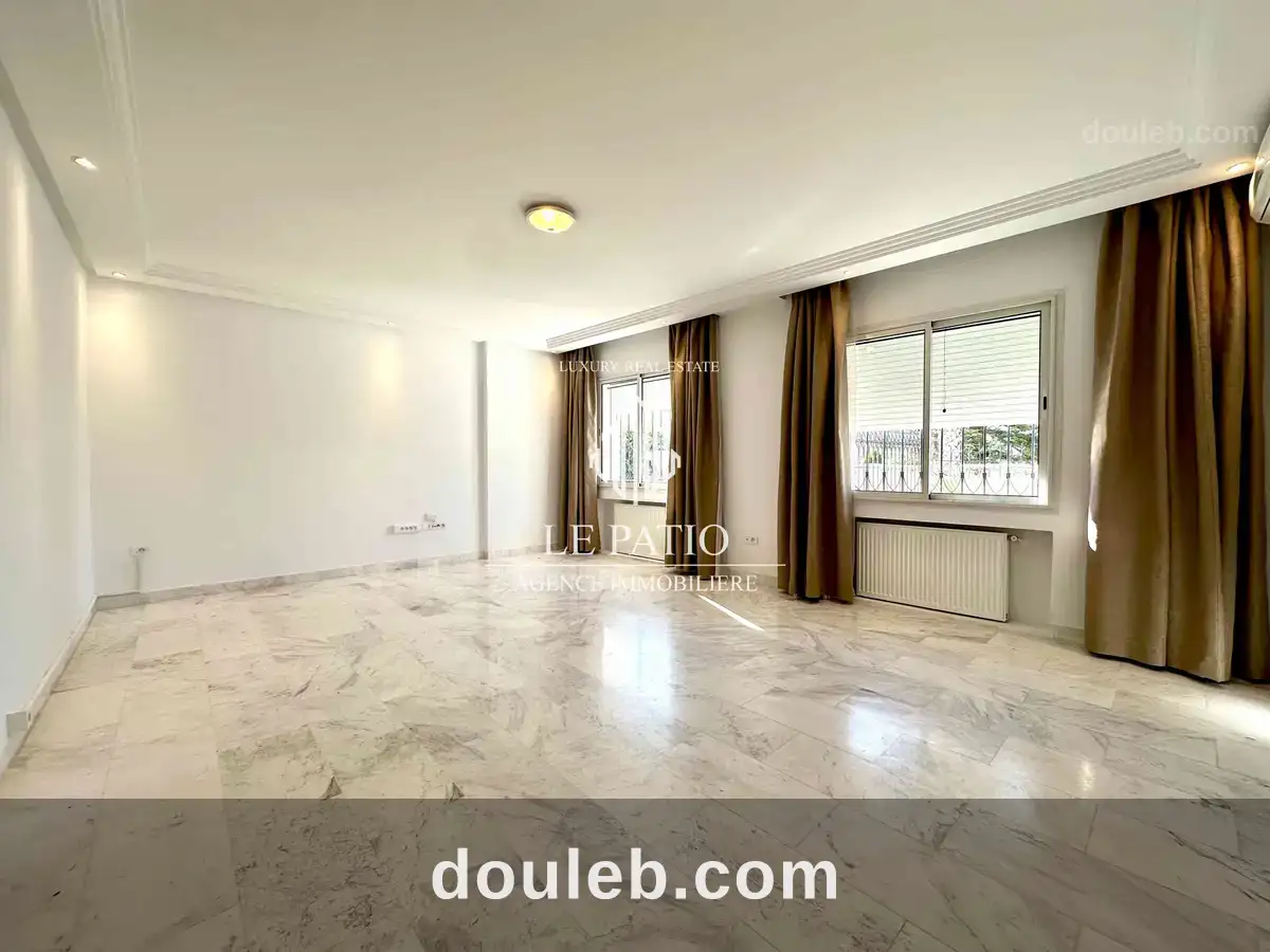 le patio immobilier tunisie met à la location un appartement haut standing avec jardin a la marsa il se compose comme suit : un grand salon. une cuisine équipée de four, hotte et plaque. une salle d'eau pour les invités une suite parentale avec dressing et une salle de bain . deux chambres avec salle de douche. abri pour deux voitures ,climatisation et chauffage central sont a la disposition pour plus d'information merci de nous contacter sur 28 287 487