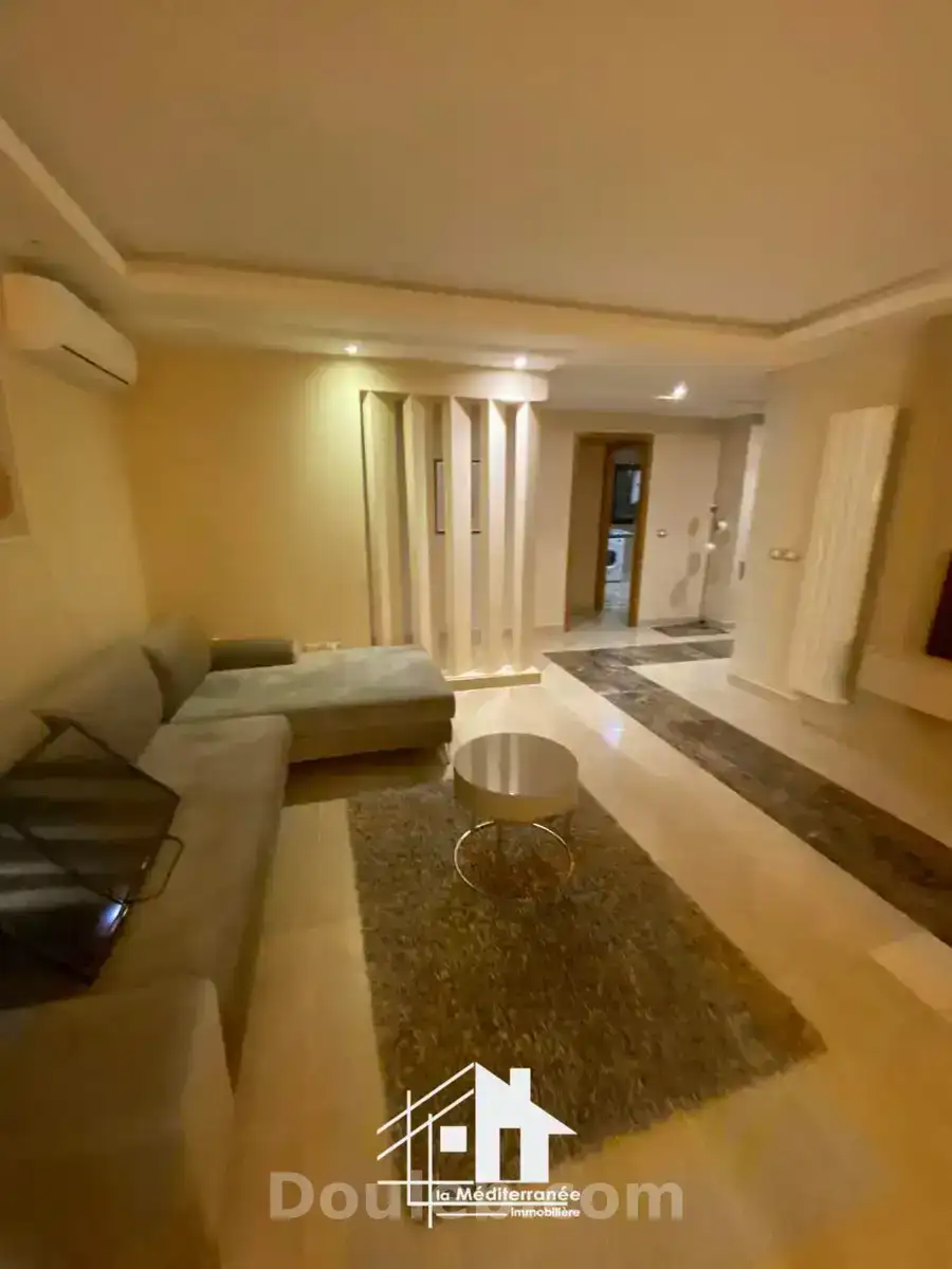 appartement s+3 meublé au 9éme étage dans une résidence r+10 aux jardin de carthage ce dernier se compose d'un salon spacieux avec de repas s'ouvre sur un balcon vue dégagée , une cuisine équipée avec séchoir , deux chambres à coucher avec dressings partageant une salle de bain , une salle d'eau invités . climatisations , chauffage central et place de parking sous sol sont disponibles