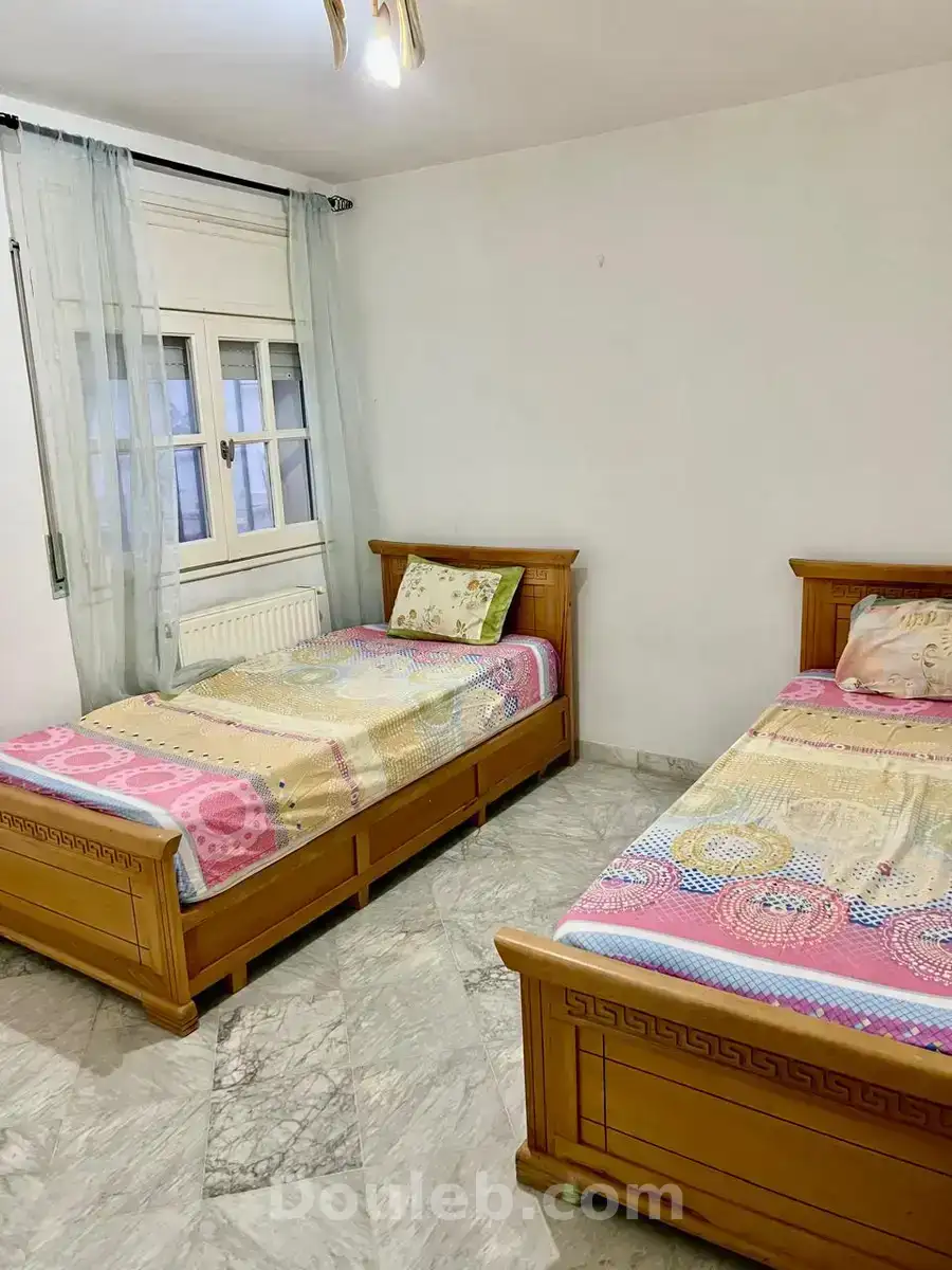 joli appartement en rez de jardin s2 bien meublé situé à l'aouina dans une résidence gardée de type r2 à mi chemin (10mn) entre tunis ville et la marsa sidi bou said et à 2 mn des berges du lac, la soukra et carthage. il est très proche de toutes commodités (supermarchés, pressing, école, jardin d'enfant, cafés, location de voiture,..). l’appartement de 120 m2 est composé d'un grand salon ouvert sur toutes les autres pièces et donnant sur la terrasse et le jardin privé ( 80 m2), une grande chambre à coucher très bien meublée, une autre chambre à coucher avec deux lits; une cuisine salle à manger entièrement équipée (cuisinière four, réfrigérateur, lave linge automatique, ustensiles de cuisine,.). la maison est équipée de tout le confort de la vie moderne (matelas orthopédiques, tv, antenne parabolique, climatiseurs, chauffage central internet,..). toutes les pièces donnent sur les jardins du coté le plus calme de la résidence avec jasmins et rosiers. loyer mensuel sur l'année : 1190 dt avec possibilité de louer au mois. location de 1 à 3 mois : 1490 pour plus de renseignements veuillez m'apeler sur le whatsapp.