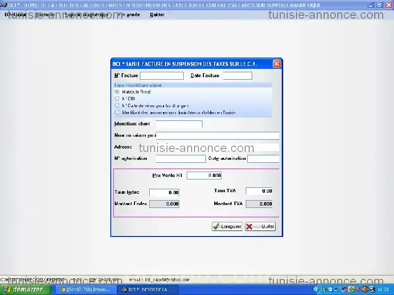 logiciel dépôt facture émies en suspension de la tva sur support magnétique selon cahier des charges 2026 du ministère des finances. contacter lotfi trabelsi au tel 98 312 409.