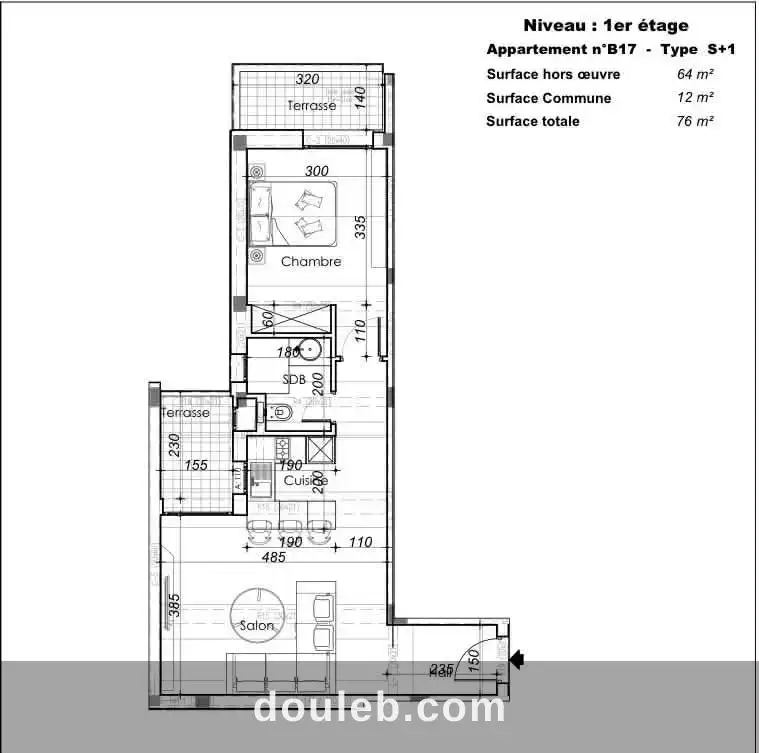 nouveau projet résidentiel proposant des appartements de haut standing dans une résidence r+4 moderne, réalisée avec des matériaux de qualité et une architecture harmonieuse. la résidence bénéficie d’un emplacement stratégique, à proximité immédiate des principales commodités, écoles internationales, clinique, commerces et axes principaux, tout en offrant un cadre calme et agréable. plusieurs typologies d’appartements sont disponibles : s+1, s+2, s+3 et duplex, avec des surfaces variées et un agencement intérieur optimisé pour offrir confort, fonctionnalité et bien-être. exemple disponible : appartement s+1 de 76 m² prix : 297 000 dt ttc place de parking en jouissance : 20 000 dt ttc remise des clés prévue avril 2026. pour plus d’informations ou pour recevoir les plans et la brochure, merci de nous contacter.