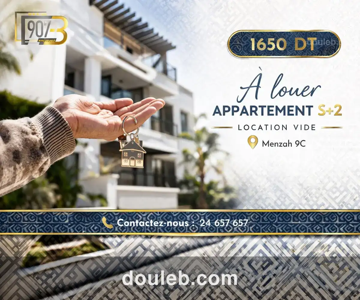 à louer s+2 haut standing superbe appartement composé d’un salon lumineux avec grand balcon, cuisine équipée (hotte, plaques, four) avec coin cellier, suite parentale, deux chambres et salle de bain. résidence avec salle de sport et piscine couverte place de parking sous-sol menzah9c 24 657 657
