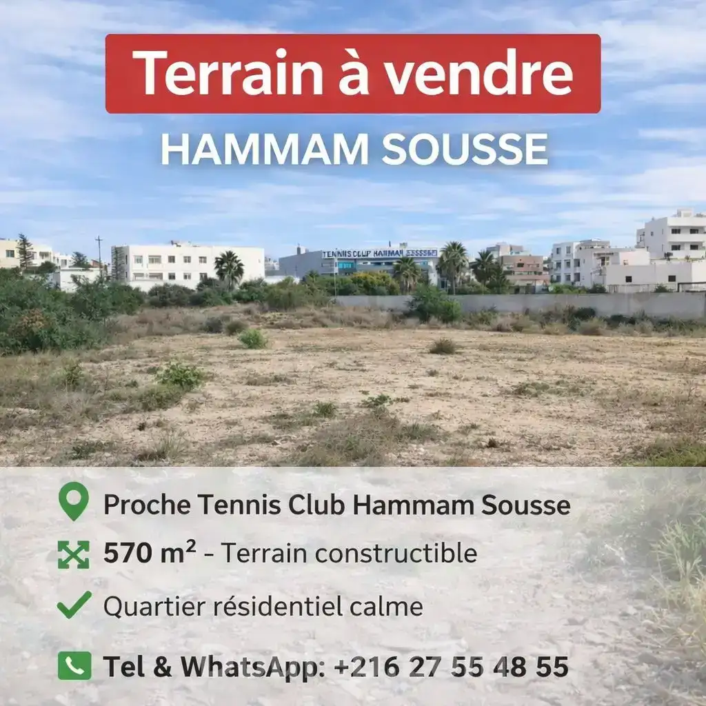 situé à quelques pas du tennis club de hammam sousse, dans un quartier résidentiel calme et en pleine expansion. idéal pour construire votre villa ou investir dans l’immobilier. tel & whatsapp : 216 27 55 48 55