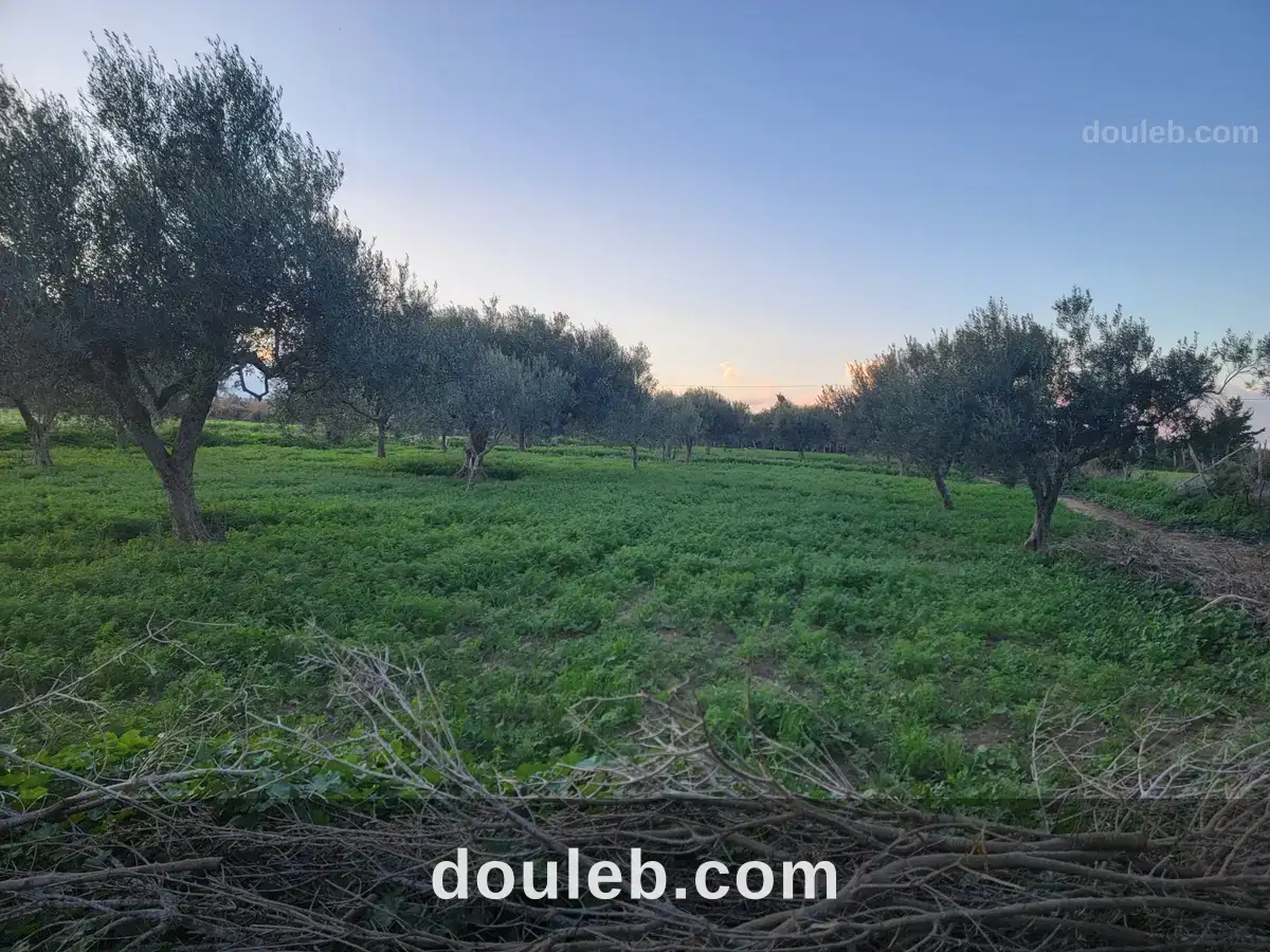 a vendre un terrain agricole sur une route principale mc27 reliant nabeul vers korba avant tazarka d'une superficie de 5160 avec une façade de 50 m et un titre foncier individuel des équipements agricoles, maison, puit , électricité , le terrain comporte 68 pieds d'oliviers et terrain nu bien entretenu .