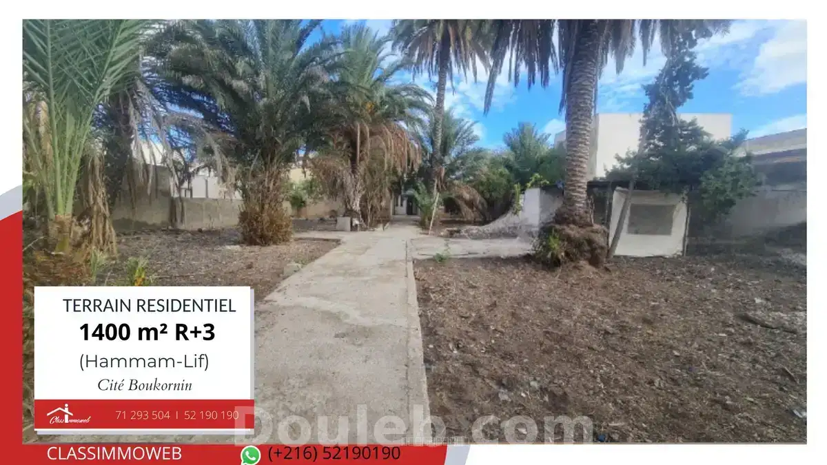 a vendre terrain de 1 400 m2 à hammam lif zone d’habitat mixte, vocation r+3 (uac2) ce terrain bénéficie d’une vocation r+3 avec cos : 0,5 et cuf : 2. le terrain, plat et parfaitement viabilisé (eau, gaz, électricité, télécom, assainissement), offre un cadre idéal pour un projet résidentiel ou d’investissement immobilier de qualité. authenticité juridique : titre foncier individuel non hypothéqué cahier des charges conforme à la zone uac2 valeur estimée : 798 000 dinars ce montant correspond à la seule valeur du terrain nu, évaluée à raison de 570 dinars le m². les constructions existantes plus de 350 m² bâtis, ne sont pas incluses dans cette estimation. ces bâtisses, bien qu’anciennes, gardent tout le charme du passé, un patrimoine authentique et inestimable. une double opportunité : pour les promoteurs, un terrain idéal conforme au cahier des charges r+3, prêt à bâtir une résidence moderne de construction de type collectif isolé. pour les amoureux du cachet traditionnel, une base parfaite pour rénover et créer une résidence de charme, un gîte ou une maison d’hôtes unique à hammam-lif. ne ratez pas cette opportunité rare. tél. : 71 293 504 / 52 190 190 / 50 486 622