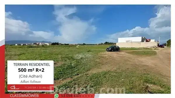 à vendre : terrain nu de 500 m² à soliman quartier dhari nous proposons à la vente un terrain nu d’une superficie de 500 m², situé à soliman, dans le quartier dhari, une zone en plein développement avec un atout exceptionnel permettant de vivre en plein nature et à proximité de toutes commodités. le terrain bénéficie d’une façade principale de 24 mètres, offrant un excellent potentiel pour un projet résidentiel, accompagné d’un bornage topographique officiel, précisant les limites exactes du lot l’environnement est agréable et prometteur, composé de villas de standing et de maisons à un seul niveau, garantissant un cadre de vie calme et valorisant prix exceptionnel : 200 dt/m², soit 100 000 dt pour la totalité du terrain. une opportunité rare à saisir, idéale pour investissement ou construction future. télé fixe 71 293 504 télé ou whatsapp 52 190 190