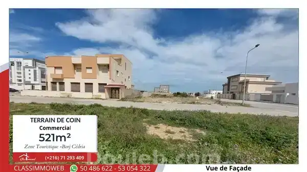 à vendre : terrain de coin commercial résidentiel de 521 m² caractéristiques principales : titre foncier individuel. viabilisation parfaite. type isolé. vocation r plus 2. double façade donnant sur 2 rues, dont une principale. orientation sud-est pour une visibilité maximale. prix 575 tnd le m². emplacement de choix : ce terrain bénéficie d'une proximité enviable avec le technopôle, le complexe universitaire et la magnifique plage d'ejjahmi. vous pouvez atteindre tunis centre ou hammamet en seulement 25 minutes via la nouvelle autoroute. potentiel illimité : ce terrain est une toile vierge où vous pouvez donner vie à vos projets les plus ambitieux. que ce soit pour un complexe commercial, des résidences de luxe ou toute autre idée, les possibilités sont infinies ! contactez-nous dès aujourd'hui pour ne pas laisser passer cette opportunité unique ! télé ou whatsapp : (+216) 52 190 190