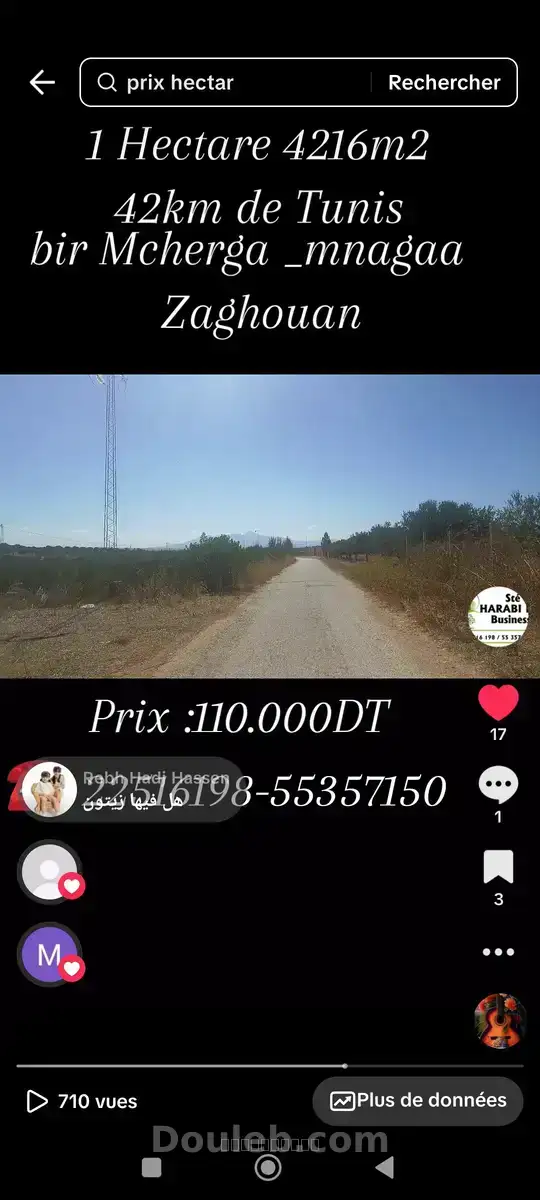 a vendre 1 hectare et 4216 m2 nu sur la route goudronnée à managaa, délégation de bir mcherga, gouvernorat de zaghouan, à 42 km de tunis, réseau d'eau potable et d'électricité disponible, excellent emplacement pour une résidence rurale et une petite ferme agricole, documents légaux, prix 110 000 dinars, négociable page officielle et tiktok -youtube : immobilier harabi pro business pour plus d’information : visite sur rdv a l'avance contactez: mr harabi ali tel: 22516198 whatsapp 216 55357150 rue habib bourguiba birmchergua 1141 première visite 30 dt et le reste des visites sont gratuites , beaucoup d' autres offres sont disponibles :des terrains agricoles , industriels , des terrains de lotissement ,de loisir et des villas #fyp #foryoupage #immobili #harabi #pro #business #immobiliere