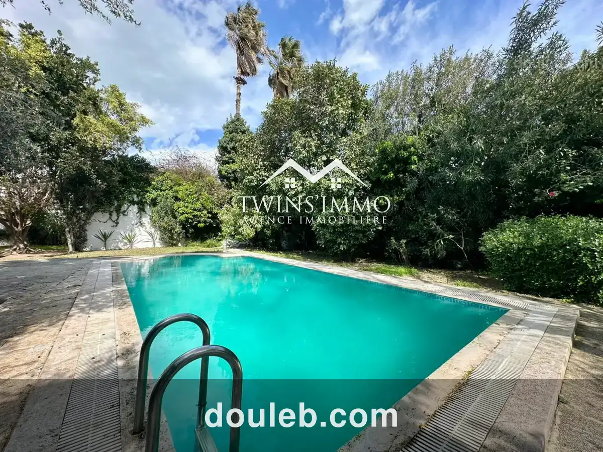 villa s+4 de plain-pied à carthage dermech, à proximité du port punique superficie terrain : 1000 m² superficie batie : 600 m² composition : un salon avec cheminée un séjour une salle d’eau une cuisine équipée de plaque, hotte et four une chambre de service avec une salle de douche une suite parentale avec un dressing et une salle de bain (avec cabine de douche) une suite avec un dressing et une salle de douche deux chambres à coucher une salle de bain chauffage central climatisation : split-système un jardin une piscine un garage pour 03 voitures