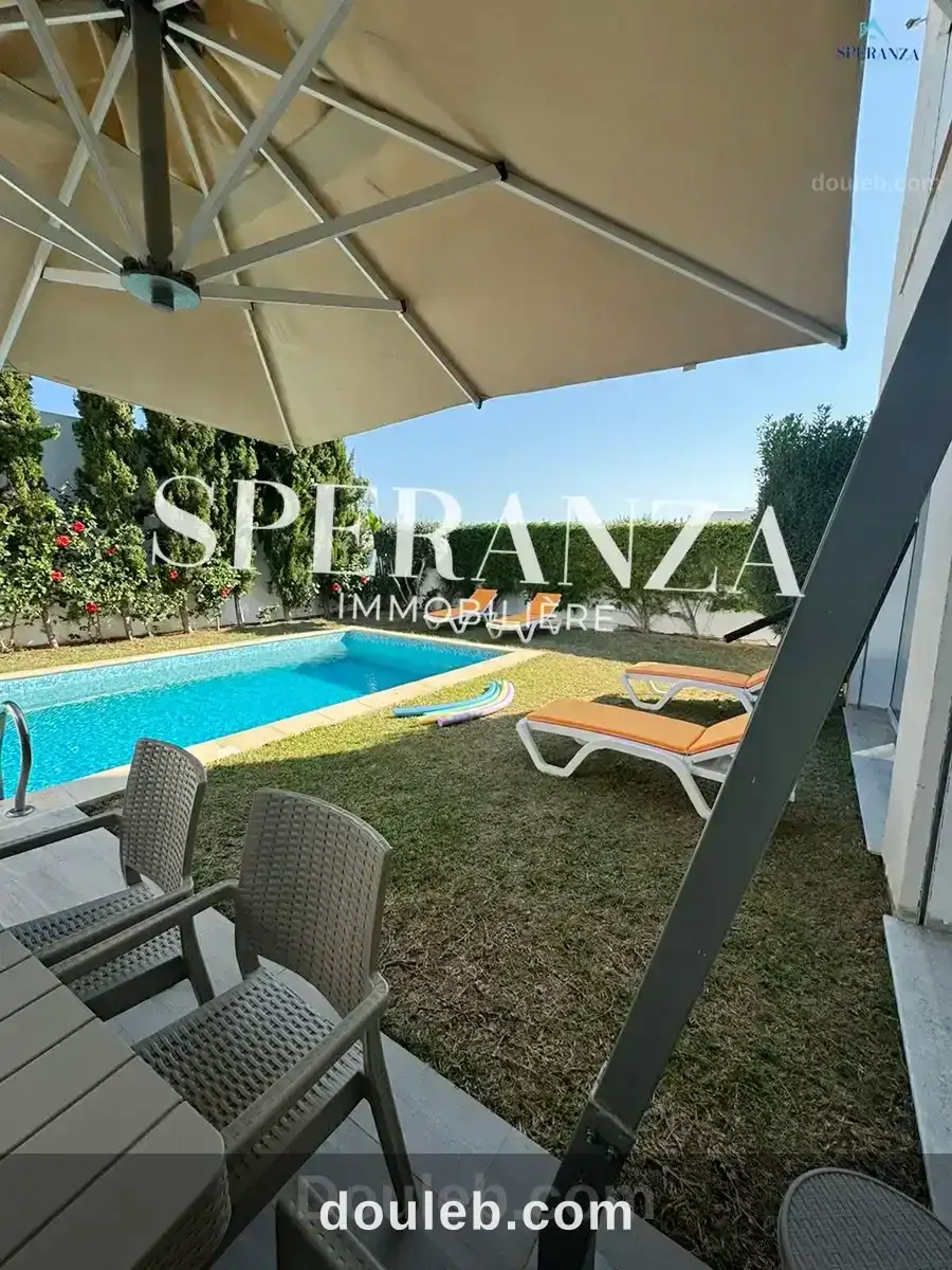 speranza immobilière hammamet vous propose à la location annuelle cette villa situe à hammamet dans un quartier calme et résidentiel l'entrée principale ouvre sur un jardin gazonné avec piscine et kitchinette, salle d’eau. la villa se repartie sur deux niveaux un réez de chaussée composée par un salon sé jour et salon lumineux grâce à ses fenêtre qui offre une vue sur le jardin et un salon a manger et une chambre,une cuisine est bien équiper et aménager avec des espaces de rangement.un escalier nous mène à la partie nuit qui se compose par deux chambres meublées par des dressings,une salle de bain et un abri pour 2 voitures